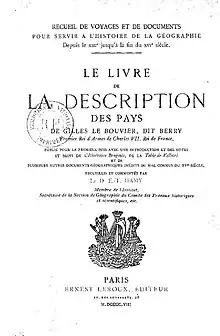 ![]() Portada de la reedición de 1908 de la obra "Le livre de la description des pays" incluyendo una edición del "Itinerario de Brujas". | ||