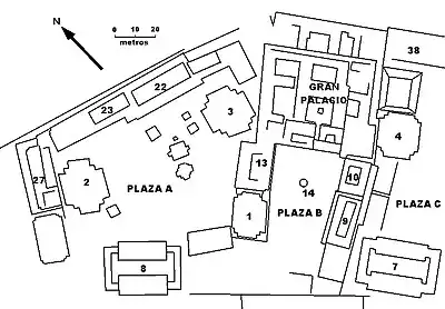 Plaza C. Quedaba separada de las Plazas A y B por un muro de 3 metros de alto y contenía el complejo del palacio del Ahpo Xajil, el gobernante menor.[69] La Plaza C también tenía dos templos, uno frente al otro a ambos lados de la plaza.[70] El juego de pelota Xajil estaba en el lado suroeste de la Plaza C, y el palacio propiamente dicho del Ahpo Xajil se situaba en el lado sureste de la plaza.[71] El palacio Xajil fue construido con una alineación este-oeste, con el patio de entrada en el lado occidental del palacio, y tenía un altar central.[71] La entrada del palacio principal se ubicaba al lado oriental del patio de entrada.[71] Las habitaciones y los patios del palacio Xajil contenían una gran cantidad de artefactos domésticos.[71] El Palacio Xajil fue destruido por un incendio que causó el colapso de las paredes de adobe; es posible que Pedro de Alvarado y sus soldados españoles fueran alojados en este complejo.[71] Es también probable que se trate del mismo edificio que los desertores españoles quemaron en 1526.[71] Debido al colapso del edificio se conservó el contenido interno del palacio para los arqueólogos, a diferencia del palacio del Ahpo Sotz'il donde se recuperaron relativamente pocos artefactos.[71]