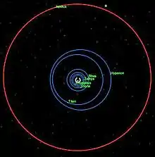 Vista lateral de la órbita de Jápeto (rojo) en comparación con las otras grandes lunas, mostrando su inclinación inusualmente alta.
