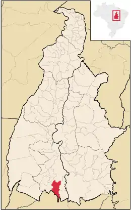 Se localiza a una latitud 12º39'18" sur y a una longitud 48º35'36" oeste, estando a una altitud de 365 metros. Su población estimada en 2004 era de 3.227 habitantes.