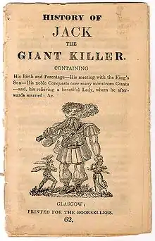 "La Historia de Jack y los Gigantes" (la edición más antigua conocida) fue publicada en dos partes por J. White de Newcastle en 1711, indican las Opies, pero no figuraba en catálogos o inventarios de la época ni Jack era uno de los Héroes populares en el repertorio de Robert Powel (es decir, Martin Powell ), un titiritero establecido en Covent Garden . Sin embargo, se hace referencia a "Jack and the Giants" en The Weekly Comedy del 22 de enero de 1708, según Opies, y en el décimo número Terra-Filius en 1721. [1]