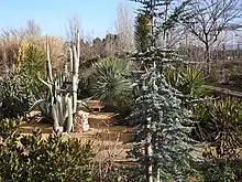 Zona destinada a la exhibición de estas plantas originarias de zonas cálidas y/o secas, mediante la selección de especies resistentes al frío. Sobre un lecho de grava de diferentes colores, según el grupo botánico, se muestra una colección de cactus (Echinopsis oxygona, Cleistocactus strausii, Opuntia macrocentra…), otra de ágaves (Agave parryi, Agave nigra, A. victoriae-reginae…) y yucas (Yucca carnerosana, Y. thompsoniana, Y. torreyi…). En las proximidades de este parterre, también se puede contemplar una pequeña colección de palmeras resistentes a los rigores del invierno mediterráneo continental (Sabal minor, Brahea armata, Butia capitata…).