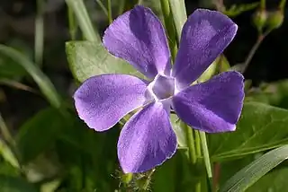 ![]() Flor de Vinca major, una de las especies cultivadas en el Jardin botanique Pierre Fabre "La Michonne". | ||