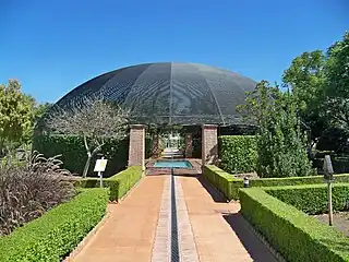 Su perímetro se encuentra rodeado por un cierre de forja. En el interior se despliega una red de caminos que circulan entre las diferentes colecciones botánicas, acompañados por un pequeño canal de agua que une en los cruces fuentes y estanques.