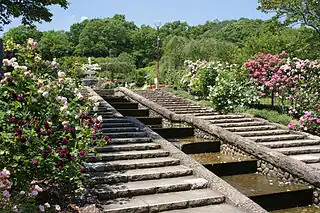 ![]() Escalinata con cascada en la rosaleda del jardín botánico Kitayama. | ||