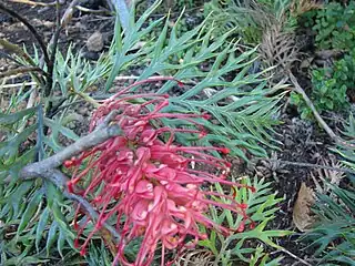 ![]() Inflorescencia del cultivar híbrido "Grevillea 'Robyn Gordon'" desarrollado por el fundador del jardín Mr Dave Gordon. | ||