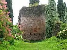 El jardín incluye las ruinas del antiguo asentamiento de Ninfa, cuyo nombre parece derivar de un nymphaeum de la época clásica, un templo dedicado a las ninfas,[2] ubicado en una isla en un pequeño lago. Se creía que las ninfas moraban en montañas y arboledas, junto a manantiales y ríos, y también en árboles, valles y grutas frescas.[3] Según el libro Ninfa: The Most Romantic Garden in the World de Charles Quest-Ritson, la primera evidencia documentada de los Jardines de Ninfa es de Plinio el Joven, quien describió un templo dedicado a las ninfas acuáticas.[4]