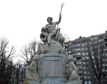 El dios Neptuno aparece como la gran figura del conjunto escultórico, bajo él un delfín. En la parte inferior aparecen tres tritones ofreciendo gansos a Neptuno. La obra es obra de Mariano Salvatierra (Neptuno) y Felix Cúsac (tritones) . La fontanería es obra de Isidro Cruela como la mayoría de las fuentes de este periodo. La fuente fue restaurada en el 2019.