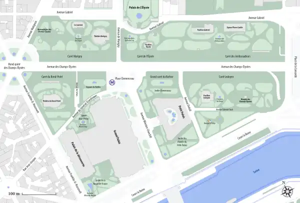 En la actualidad, el parque está dividido en dos por una de las arterias con más tráfico de París, la avenida de los Campos Elíseos, pero aun así consigue proporcionar rincones tranquilos para la calma, la reflexión y la apreciación de la naturaleza. El rincón más remoto y silencioso del parque se encuentra en el suroeste, a lo largo de la Avenue Franklin D. Roosevelt y entre el Grand Palais y el Cours-la-Reine. Esta sección del parque se llama Vallée Suisse o «valle suizo», que tiene un arroyo que pasa bajo un sauce llorón y ofrece una selección de árboles antiguos y exóticos. Otro pequeño jardín tranquilo con una fuente, la Square Jean Perrin, se encuentra justo al norte del Grand Palais y del Palais de la Découverte, junto a la Avenue du Général Eisenhower.