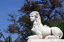 Se encuentran junto a la fachada del palacio. Las esfinges no aparecen como parte del jardín hasta un plano de 1920; sin embargo, se datan en el XVIII. Su autoría podría estar relacionada con Juan Martínez Reina, que realizó varias sirenas o esfinges en 1758, o bien con Olivieri.[11] Simbolizarían la protección eterna de la residencia real.[12] En el jardín también se encuentran cuatro de los veintiocho vasos de Thierry llevados en 1804 a Aranjuez procedentes de los jardines del Palacio Real de la Granja de San Ildefonso; en dos de ellos se representan las cuatro estaciones, mientras que en los otros dos se representan mascarones báquicos con guirnalda de roble y hiedra.[13]