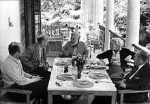 D. Bill Davis, propietario entonces, D. Rupert Belleville, el novelista estadounidense D. Ernest Hemingway, Dña. Mary Hemingway y D. Juan Quintana durante un almuerzo en La Cónsula en 1959