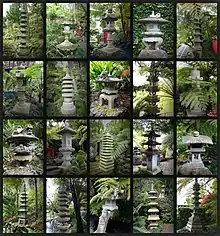 - Jardines de té (Rōji). Camino que conduce a la cabaña de paja, atravesando el lugar en donde cae el rocío. Se colocan piedras sobre musgo, para evocar esta idea del rocío. Para el camino se usan baldosas regulares o piedras irregulares colocadas en línea recta.
