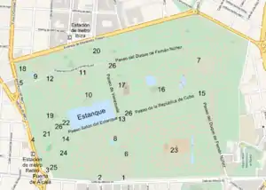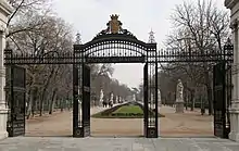 • Puerta de la Independencia. Se edificó en 1817 como el ingreso principal del Casino de la Reina, una antigua posesión real ubicada en la Ronda de Toledo. En 1885 fue trasladada al Retiro bajo la dirección de José Urioste y Velada (1850-1909), arquitecto y urbanista que acometió profundas reformas en Madrid, como el ensanche de la Gran Vía. Es de orden dórico y está adornada en su remate con dos grupos escultóricos de Valeriano Salvatierra (1788-1836). Situada junto a la Puerta de Alcalá, pone en contacto la Plaza de la Independencia, de la que toma su nombre, con el Paseo de México.[36]