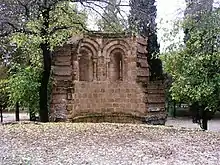 Durante la guerra de la Independencia (1808-1814) el Buen Retiro fue utilizado como cuartel general de las tropas napoleónicas, lo que provocó daños de consideración tanto en el palacio como en los jardines, además de su expolio. Tras el regreso a España de Fernando VII (1784-1833) en 1814, se procedió a la recuperación de la zona ajardinada, con la incorporación de nuevos elementos arquitectónicos, mientras que apenas se intervino sobre la residencia y las ermitas. El proyecto fue redactado por Isidro González Velázquez (1765-1840)[26] y significó la transformación romántica del lugar.