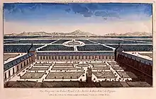 Proyecto para el Buen Retiro (1714-1715), de Robert de Cotte. Biblioteca Nacional de Francia de París. A la derecha del palacio se sitúa el Parterre, la única parte que se hizo, según diseño de René Carlier.