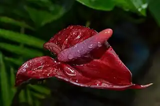 ![]() Espécimen de Anthurium andraeanum una de las especies cultivadas en los "Jardines tropicales de Hilo". | ||