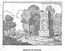 Sepulcro de Escipión (Torre de los Escipiones), xilografía de Josep Gaspar por dibujo de Jaime Batlle. El Museo de Familias (Barcelona), n.º 1, 1838, p. 60.