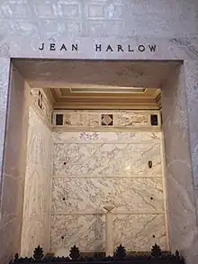 Fue enterrada en el Gran Mausoleo en Forest Lawn Memorial Park en Glendale en una cripta privada de mármol multicolor, que William Powell compró por $25 000 —$471 000 hoy—.[124] La enterraron con el vestido que usó en Libeled Lady y en sus manos tenía una gardenia blanca junto con una nota que Powell había escrito: «Buenas noches, mi querido cariño». La inscripción de Harlow dice: «Nuestra Baby».[125]
