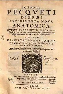 • (en latín) Experimenta nova anatomica, quibus incognitum hactenus chyli receptaculum, et ab eo per thoracem in ramos usque subclavios vasa lactea deteguntur. Ejusdem Dissertatio anatomica de circulatione sanguinis et chyli motu. Accedunt clarissimorum virorum perelegantes ad authorem epistolae, apud S. et G. Cramoisy (Parisiis), 1651, in-4° , pièces limin., 108 p., disponible sur Gallica.