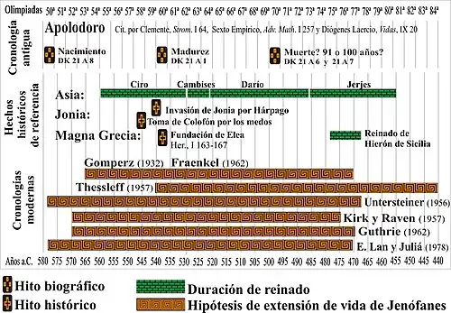 La mayoría de las especulaciones acerca de la fecha de nacimiento de Jenófanes, como las de otros presocráticos, proviene de Apolodoro (su opinión nos ha sido trasmitida por Diógenes Laercio, Sexto Empírico y Timeo a través de Clemente de Alejandría).[3] Indica la Olimpíada 50.ª (580 – 577 a. C.) como fecha de nacimiento, y su madurez en la Olimpíada 60.ª (540 – 537 a. C.). La datación de Apolodoro ha sido puesta en duda, porque toma fechas históricas como referencia simbólica para marcar la madurez de un pensador (en este caso sería la fundación de Elea en la Olimpíada 50.ª), madurez que es alcanzada, según él, a los 40 años. Restando 40 a la fecha indicada, se obtendría la fecha de nacimiento.