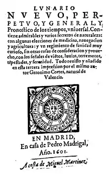 - Lunario nueuo, perpetuo, y general, y pronostico de los tiempos, uniuersal. Madrid: Pedro Madrigal. 1601.