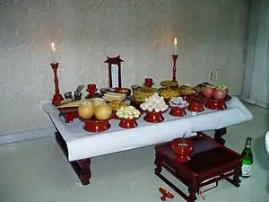 - Gije (기제, 忌祭, también denominado gijesa) - ritos del hogar que se realizan la noche anterior o la mañana del aniversario del fallecimiento del ancestro (기일, 忌日).