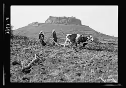 ![]() vista de campesinos drusos con el Castillo de Salkhad al fondo (cercano a Jirbet Awad).