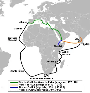 Este mapa muestra la ruta de los exploradores Pêro da Covilhã y Afonso de Paiva; el trazado verde indica el camino realizado juntos; el naranja, el camino seguido por el primero; el azul el recorrido por el segundo. También se muestra la ruta marítima a la India, recorrida pocos años más tarde por Vasco da Gama.