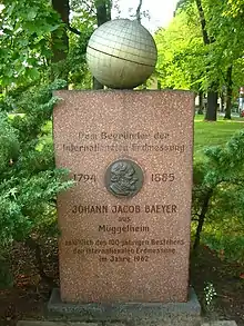 " Al fundador de la / Geodesia Internacional / 1794-1885 / Johann Jacob Baeyer / en Müggelheim / con ocasión del 100 aniversario / de la Geodesia Internacional / en 1962. "
