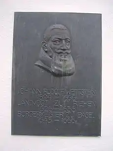 ![]() Placa conmemorativa en la casa de Riehen donde residió de 1626 a 1635 | ||