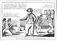 Una representación más negativa de John Bull se produjo en las caricaturas dibujadas por el periodista nacionalista egipcio Yaqub Sanu, en su popular periódico clandestino "Abu-Naddara Zarqa" a fines del siglo XIX y principios del XX. Las caricaturas de Sanu[5] representaban a John Bull como un hombre grosero, matón, borracho e ignorante, que abusaba de los egipcios comunes mientras robaba todas las riquezas de Egipto.[6] Gran parte del humor de Sanu giraba en torno al alcoholismo de John Bull, sus burdas groserías, su ignorancia sobre prácticamente todo excepto el alcohol, y su incapacidad para hablar correctamente el francés (el idioma de la élite egipcia), que John Bull destrozaba hilarantemente, a diferencia de los personajes egipcios que hablaban un francés correcto.[7]