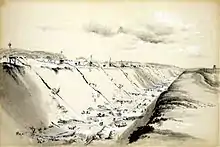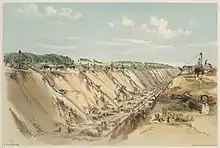 - En el dibujo, la excavación de un túnel está muy avanzada. Una sola vía atraviesa la galería (finalmente tendría dos vías) mientras que los trabajadores (peones) se reúnen debajo de un pozo. Dos caballos, enjaezados para el transporte, están parados pacientemente muy cerca. Un grupo de hombres lucha por mover una cesta de escombros y, por encima de ellos, un trabajador sube a la superficie con más escombros. En el fondo, a la derecha, sale humo de un fuego mientras que en el primer plano, a la derecha, un trabajador afila una herramienta con una piedra de amolar. En ese momento, la mayoría de los compañeros artistas de Bourne estaban preocupados por capturar el idílico ambiente pastoral de los campesinos que realizaban tareas rurales. Pero Bourne celebraba el arduo trabajo de los peones de una manera casi sagrada. Usaba la luz del pozo para crear una atmósfera espiritual, donde el hombre asciende hacia el cielo...[18]