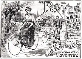 En 1885, Starley hizo historia cuando produjo la bicicleta de seguridad Rover.[7][8] La Rover era una bicicleta de tracción trasera por cadena, con dos ruedas de tamaño similar, y mucho más estable que los diseños anteriores de biciclos de ruedas altas. La revista Cycling afirmó que la bicicleta Rover había "establecido un patrón de alcance mundial" ("set the pattern to the world") y la frase fue utilizada en sus anuncios durante muchos años.