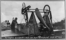 Una fotografía del avión de Moisant volcado tras un choque aterrizando el 23 de octubre de 1910.