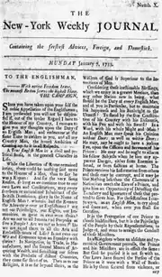 En 1733, Zenger comenzó a imprimir The New York Weekly Journal, que expresaba opiniones críticas con el gobernador colonial, William Cosby.[3] El 17 de noviembre de 1734, por orden de Cosby, el sheriff arrestó a Zenger. Después de que un gran jurado se negara a acusarlo, el fiscal general Richard Bradley lo acusó de difamación en agosto de 1735.[4] Los abogados de Zenger, Andrew Hamilton y William Smith, Sr., argumentaron con éxito que la verdad es una defensa contra los cargos de difamación.[5]