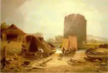 - Esta acuarela descolorida representa una de las dos pinturas medievales de Norwich. Torres a través del río Wensum, posiblemente hecho c. 1809. Thirtle pintó la torre en cinco ocasiones diferentes.[58]