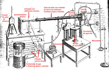 Tyndall mejoró los experimentos de Eunice Newton Foote (publicados en 1856[6]) utilizando una fuente de rayos oscuros (denominación de la época de la radiación térmica infrarroja) y aisló el gas a estudiar en un tubo de latón tapados por ambos extremos con cristales de sal con objeto de dejar pasar solo el infrarrojo y demostrar así, más allá de toda duda razonable, que el CO2 absorbía en este rango del espectro calentando el gas del recipiente. Tyndall estuvo motivado por la causas de los climas del pasado, en concreto por mecanismo de los cambios de temperatura en las eras glaciales.[5][7]