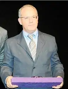 ![]() José Manuel Suárez recibiendo el XII Premio Ciudad de Salamanca de Poesía. | ||