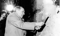 ![]() El Dr. José Pedro Cardoso rompiendo la tapia de las puertas de la Casa del Pueblo en 1984, cuando la dictadura militar devolvió la Sede al PS. | ||