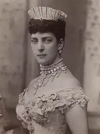 La tiara de gran duquesa Vladimir ( ru: Владимирская тиара ), a veces llamada la tiara de diamantes y perlas, fue comprada, junto con un rivière de diamantes, por la reina María a la gran duquesa Elena Vladimirovna de Rusia, madre de la duquesa de Kent, en 1921 por un precio de £ 28,000.[30] La gran duquesa, conocida después de su matrimonio como la princesa Nicolás de Grecia, la heredó de su madre, la gran duquesa María Pavlovna, quien la recibió como regalo de bodas de su esposo en 1874. Originalmente tenía 15 perlas grandes, y fue hecho por el joyero Carl Edvard Bolin a un costo de 48.200 rublos.[31][32]