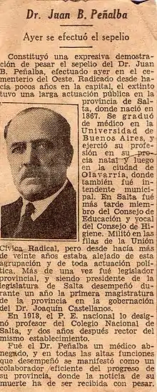 - Fuentes: Diario “La Nación”, Buenos Aires, 4 de marzo de 1938. Diario el Tribuno, Salta: “Centenario del nacimiento del Dr. Juan B. Peñalba”, 07.09.1967. Fernando R. Figueroa, “Historia de Salta”, Editorial Plus Ultra, Bs. As., 1977, pág.63. Enrique Pereira, crónica en https://web.archive.org/web/20110924035229/http://diccionarioradical.blogspot.com/2008/05/pealba-juan-b-por-enrique-pereira.html>