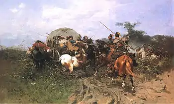 Las condiciones de la marcha del ejército fueron difíciles. El ejército tuvo que avanzar entre bosques bajo un clima adverso y soportando el hambre. Muchos soldados protestaban y pedían volver a su país, pero Juan Sobieski prometió alimentos, pastos para los caballos y el saqueo rico del campamento turco. Poco después se unió a los polacos un grupo de valacos, comandados por el Príncipe Stephen Petryczaïko[47], que habían abandonado a los turcos para luchar junto a los cristianos. El 9 de noviembre el ejército llegó a Chocim, donde fue recibido con el sonido del cañoneo turco.