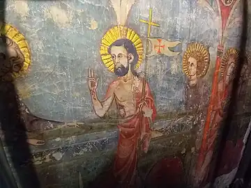 El mural, pintado al temple y pasado a lienzo, conservado actualmente en el Museo de Navarra,[5] aparece dividido en tres cuerpos horizontales y banco a la manera de un retablo. En él se representan escenas de la pasión, muerte y resurrección de Cristo —Flagelación y Jesús con la cruz a cuestas en el cuerpo superior, la Crucifixión, con Longinos, Estefatón, las Marías con san Juan y ángeles recogiendo la sangre vertida por Cristo en el central, y el Santo Entierro con la Resurrección en el inferior— con cinco juglares y los escudos del obispo Arnaldo de Barbazán, las casas de Évreux y Foix-Bearne y el arcediano Miguel Sánchez de Asiáin en el banco.[6] El conjunto se completa con dos bandas laterales en las que están representados en cada una de ellas seis profetas portadores de filacterias. También sería suya una cabeza de Cristo en marco ojival localizada originalmente en la escalera de acceso al púlpito del lector del mismo lugar, pasada a lienzo y trasladada al museo a la vez que el gran mural de la Pasión.