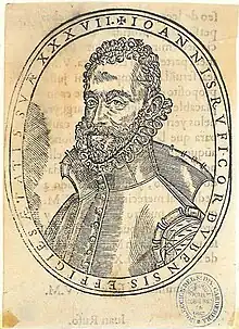 ![]() Juan Rufo Gutiérrez, ilustración de La Avstriada, Madrid, 1584. Inscripción: «Ioannis Rvfi Cordvbensis effigies. Aetatis svae XXXVII». Biblioteca Nacional de España. | ||