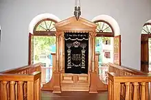 La mayoría de las sinagogas españolas y portuguesas son, como las de los judíos italianos y romaníes, caracterizadas por un diseño bipolar, con el tebá bimah, cerca de la pared opuesta al Hejal. El Hejal tiene su cortina dentro de sus puertas, en lugar de afuera. Los sefarim (rollos de la Torá) usualmente están envueltos en un manto muy ancho, muy diferente de los mantos cilíndricos utilizados por la mayoría de los judíos asquenazíes. Tikim, cilindros de madera o metal alrededor de los sefarim, por lo general no se utilizan. Estos fueron utilizados, sin embargo, por la comunidad judía portuguesa en Hamburgo.