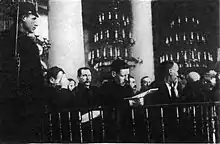 ![]() Fiscal General Andréi Vyshinski (centro), leyendo una acusación en 1937. | ||