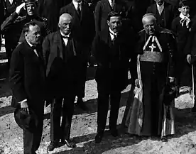 Visita del presidente Marco Fidel Suárez al departamento de Nariño. En los extremos de la fotografía aparecen, además, el gobernador Julián Bucheli y el obispo Antonio María Pueyo de Val. 1920. Autor: Anónimo. Archivo: Carlos Benavides Díaz.