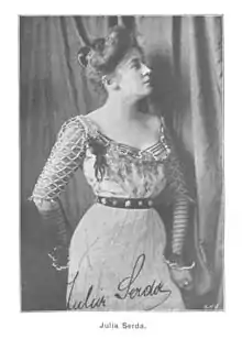 Julia Serda actuaba como actriz de carácter en obras como Die Jüdin von Toledo, Salomé (de Oscar Wilde), Johannisfeuer (de Hermann Sudermann), Kabale und Liebe (de Friedrich Schiller ), o La conjuración de Fiesco (de Schiller). Más adelante ya hizo primeros papeles, en obras representadas en teatros de Berlín y Viena.