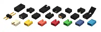 En electrónica y en particular en informática, un jumper es un elemento que permite cerrar el circuito eléctrico del que forma parte dos conexiones. Esto puede hacerse mediante soldadura (se derrite suficiente estaño para cerrar el circuito), soldando un cable o alambre entre ambos puntos o, lo más frecuente, conectando dos pines en hilera o paralelo mediante una pieza de plástico que protege el material conductor que cierra el circuito. Los más habituales tienen tamaños de 2,54 mm, 2 mm y 1,27 mm.[1]