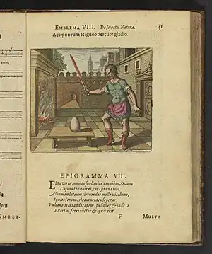 ![]() Emblema VIII. Accipe ovum & igneo percute gladio (Toma el huevo y golpéalo con una espada de fuego), incluido en el manuscrito alquímico Atalanta fugiens del médico alemán Michael Maier. Imagen de portada en la edición española publicada por Ediciones Atalanta. | ||